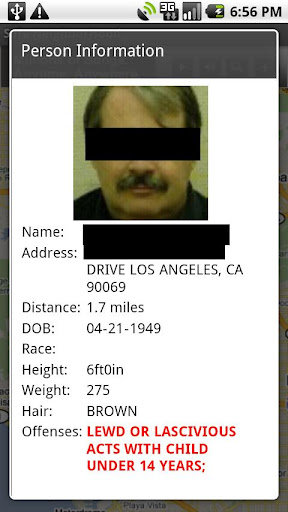 Search by your address or current location(US Only) to see if any sex offenders are registered in the area. View on a map and see their personal info + photos.